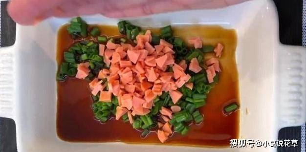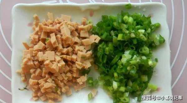 第一步:我們需要準備一個平底瓷碗,用清水沖洗幹凈,然後把蔥切成蔥花,火腿切成小塊裝盤備用。切火腿的時候,切得越小越好,這樣口感更細膩。