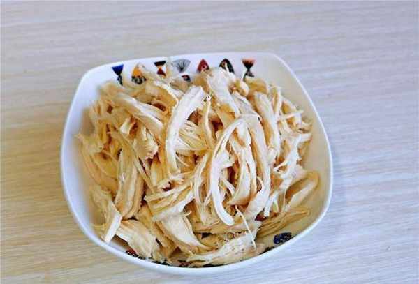 2.雞肉泡水15分鐘,去掉肉的血水,然後放入鍋中,加入適量的水和少許料酒,燒開後,改中小火煮熟10分鐘,用筷子煮透雞胸肉很容易刺透,說明雞胸肉熟瞭。將煮熟的雞胸肉撈出,放入冷水中冷卻,然後用手撕成絲,盛入碗中待用。