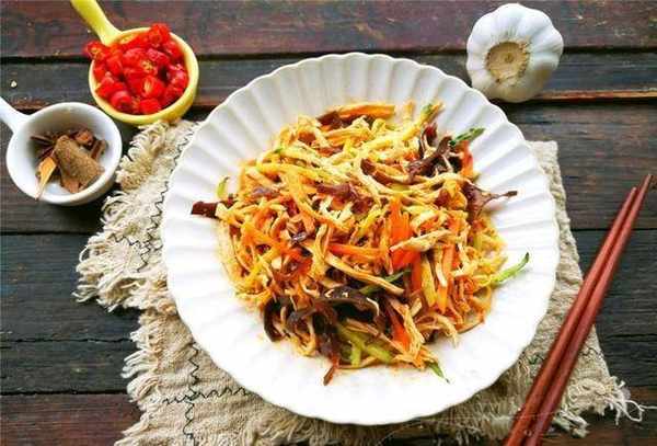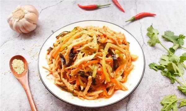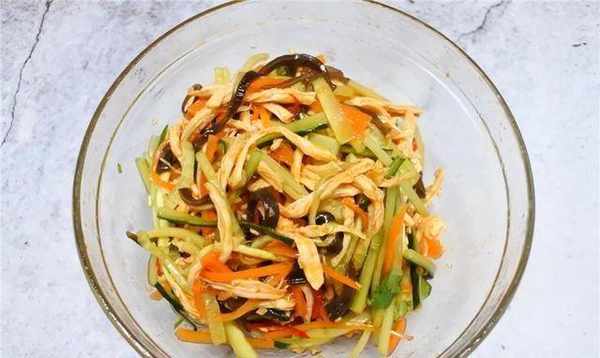 5、將準備好的雞肉、胡蘿卜、黃瓜、香菇放入鍋中,再倒入準備好的醬汁,用筷子拌勻,即可上桌。這道美味的冷沙拉是用切碎的雞肉和黃瓜做成的。如果傢裡煮過白芝麻,可以撒上一些白芝麻做點綴,吃起來會更香。
