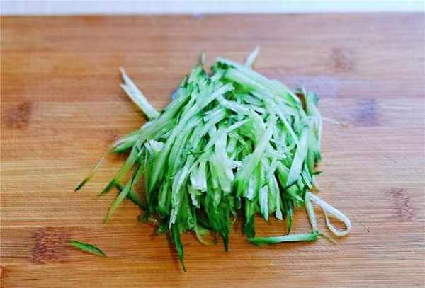 1.準備好所需的材料,取一個碗,倒入適量的水,先將幹香菇泡水(不要泡太久。約需1小時),鍋內加入適量清水,待火燒開後,將香菇末放入鍋中煮約1-2分鐘,撈出放入冷水中。涼瞭,最後用刀切成細條。
