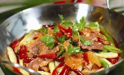 原料:海南帶皮小黃牛(購回後用噴槍把牛皮上的毛燒掉,再用刀刮洗幹凈)500克,紅辣椒10克,蔥粒20克。