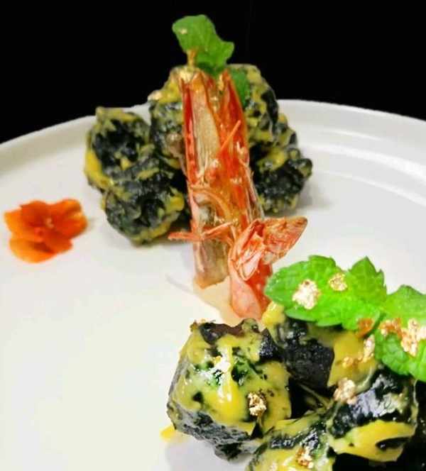 虎蝦3隻、榴蓮果肉1塊、芒果50克、檸檬片3片、竹炭粉、脆炸粉、金箔粉、沙拉醬、白糖