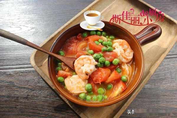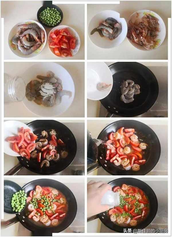 制作:鮮大蝦去殼後,從蝦背上剝開,挑出蝦線,這樣用鮮蝦取出來的蝦仁比冰凍的蝦仁更鮮嫩, 蝦仁加入少許鹽、料酒和淀粉等調味料拌均勻。熱鍋涼油,將醃制好的蝦仁放進中鍋翻炒至變色,加入番茄塊進鍋翻炒至微微出汁,加入少許水燉煮,再加入準備好的豌豆米進鍋去煮,最後加入少許鹽和胡椒粉調味即可。