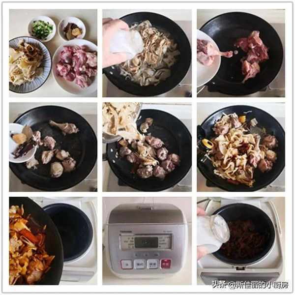 制作:燒鍋水加入少許鹽, 將準備好的筍片放入鍋中煮上3分鐘後撈出; 熱鍋涼油,將準備好的鴨子塊放入鍋中煸炒出油來,加入少許薑片、桂皮、香葉等大料進鍋翻炒兩下; 加入筍片進鍋繼續翻炒兩下; 加入少許料酒、生抽和老抽進鍋翻炒均勻; 將炒好的食材放入電飯煲中,加入沒過食材的水,按下電飯煲上煮米飯的功能鍵; 時間到,“鴨肉燜筍”就煮好瞭, 再加入少許鹽和胡椒粉調味,最後放入蔥花即可。