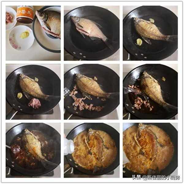 制作:熱鍋涼油, 將鯿魚表面水分吸幹後入鍋煎至雙面金黃, 空餘邊放入薑片煸一下;再加入少許肉末在鍋的空餘邊煸炒至變色,加入少許料酒和生抽,一次性加入適量的水,加入1勺沙茶醬繼續燉煮約8分鐘左右,加入少許鹽調味, 大火收汁,中間將魚翻個面, 以便魚的雙面入味,最後撒入蔥花即可。