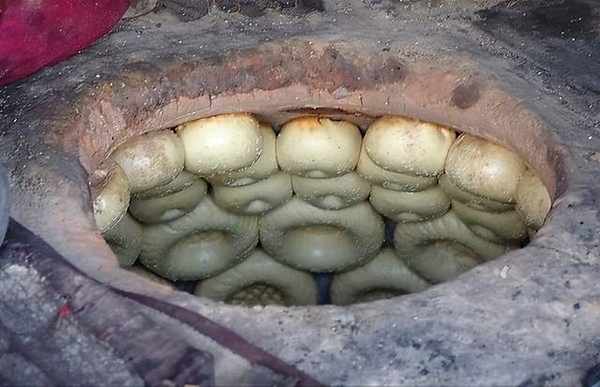 因此,城鎮的飯館、食堂都有馕賣,而且烤馕的作坊、攤點佈滿街巷,幾乎是十步一鋪、五步一攤,邊烤邊賣,生意紅火。據說唐僧取經路過吐魯番時,穿越沙漠戈壁時,身邊帶的食品就是馕。是馕幫助他走完充滿艱辛的旅途。維吾爾族的烤馕設備最主要的是馕坑。馕坑可設在庭院或傢門口,其燃料大都用柴,現在也有用無煙煤的。馕坑也別具一格,由於地區的不同,馕坑的式樣和材料也不同。馕坑的大小是根據人口來定的,一般分大中小三種型號。在農村、集鎮,幾乎傢傢都有烤馕的馕坑,婦女個個都會烤馕(維語稱為打馕)。一般馕坑是用羊毛和入粘土砌築成的,它高約一米左右,肚大口小,形似倒扣的寬肚大水缸。底部架火,通常是夯土結構,馕坑四周圍用土坯壘成方形土臺,以便烤馕人在上面操作。馕底部留有通氣口。南疆一些地區則選用硝土做馕坑坯,烏魯木齊地區以及一些城市的居民則用磚塊做馕坑坯。烤馕前,先將幹柴(木炭或煤炭)放在坑底燃燒,待明火消失時,坑壁已燒得滾燙,即可把搟好的馕面胚貼在坑壁上,十分鐘便能烤熟。馕坯上可以抹點食油、撒些芝麻、蔥花,烤出的馕更脆更香。維吾爾族人除瞭用馕坑來烤馕外,還用馕坑來烤羊肉或羊腿。新疆少數民族,特別是維吾爾族,除瞭用馕坑烤馕外,還用大鐵鍋油炸肉馕,用蒸籠來蒸“奧爾”馕,用熱柴禾灰烤馕。
