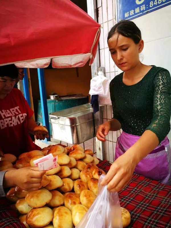 在和田,為瞭街拍這位美女我們買瞭她的馕。