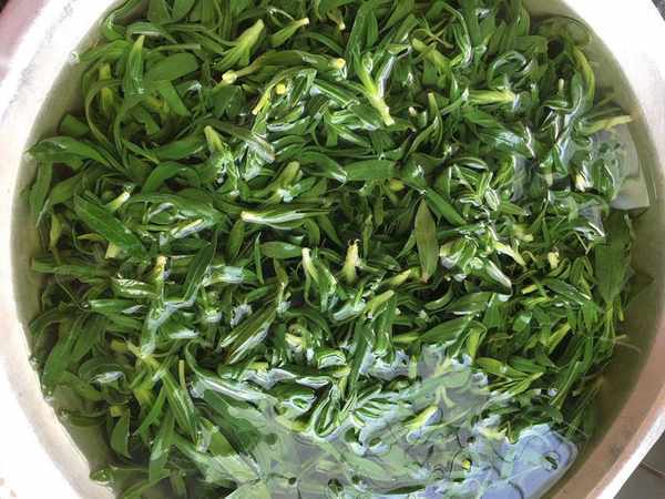 2、山苜蓿吃的是它的嫩尖部分,所以我們在摘的時候就挑著嫩尖的部分即可,摘回來之後,先挑一挑,有老葉的話去掉,也不可避免會有雜草,我們也要挑出去。把調好的山苜楂放到大盆中,先加一勺鹽攪拌至溶化,讓山苜楂在水中泡一會兒。然後再繼續用清水多次淘洗,確保將其中的灰塵雜質洗幹凈,然後將其撈出來,在瀝水籃中控幹水分。