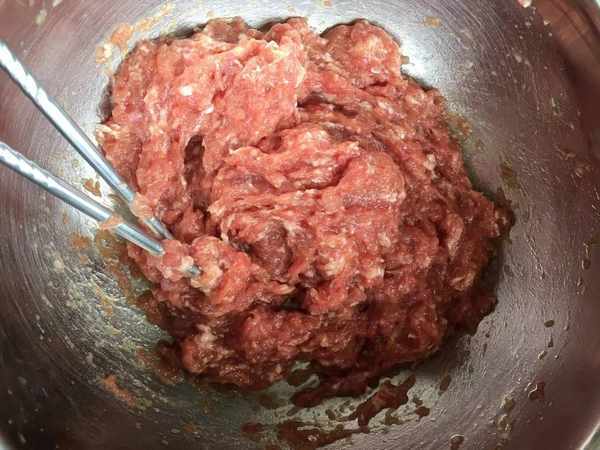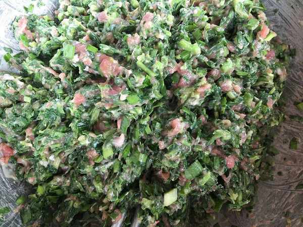 5、把處理好的山苜楂放入肉餡中,放一把蔥花,與肉餡拌勻,餡料的部分就完成瞭。