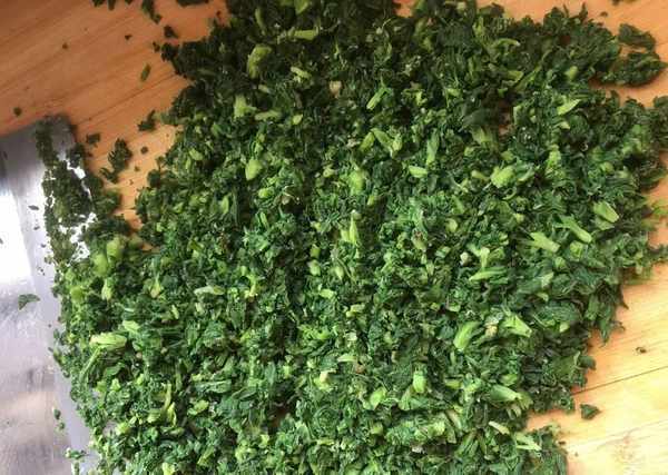 3、山苜楂也為野菜的一種,其中難免有草酸,並且有苦味,我們先燒一大鍋熱水,放一點食用油,把山苜楂放到沸水中焯燙一遍,變色之後迅速撈起,放到冷水中降溫。接著撈出來,擠掉水分,放到案板上剁成小碎丁。