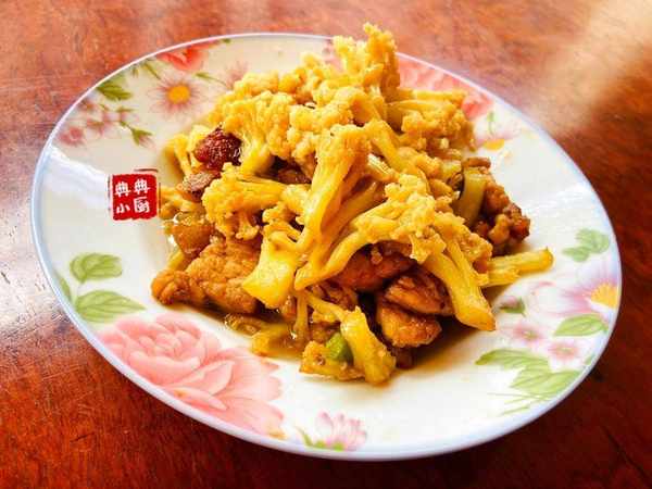 肉燒花菜。先把花菜泡起來,燒之前需要焯一下水,鍋裡不放油,把肥肉先下鍋煸炒至出油之後下瘦肉炒變色,加生菜,翻炒幾個,加一點生抽,一點蠔油,一點開水,燜燒一會,加鹽提味就可以出鍋瞭。