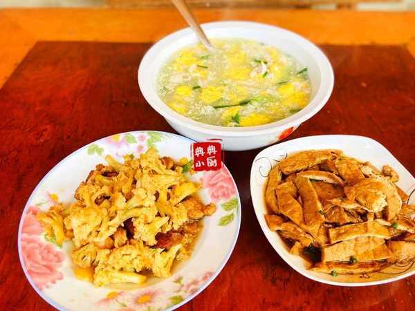 跟孩子兩人在傢吃的話,其實兩道菜也就夠瞭,騎車回來的時候,看到有鹵菜,老傢的烤鴨鹵幹是我跟孩子最愛吃的,但因為中午有肉瞭,不想再買烤鴨,我跟她就買瞭點鹵幹子回來。中午炒個花菜,再燒個絲瓜湯就可以瞭。