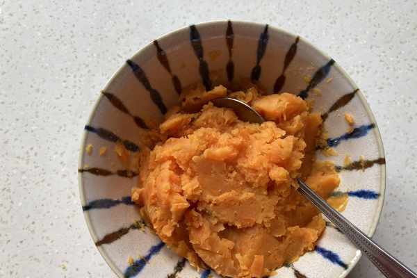 4.蒸好的紅薯用勺子按壓成泥。