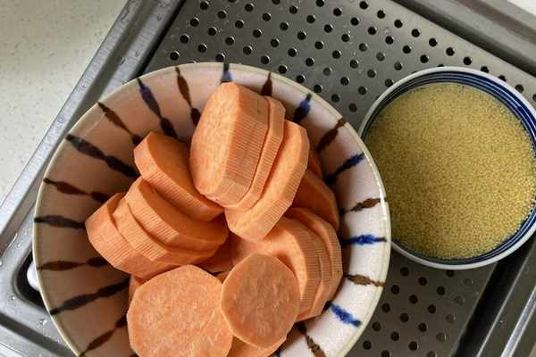 3.將紅薯放入大碗中,小米洗淨放入碗中加開水至碗平,將小米和紅薯放入蒸鍋中蒸二十分鐘。