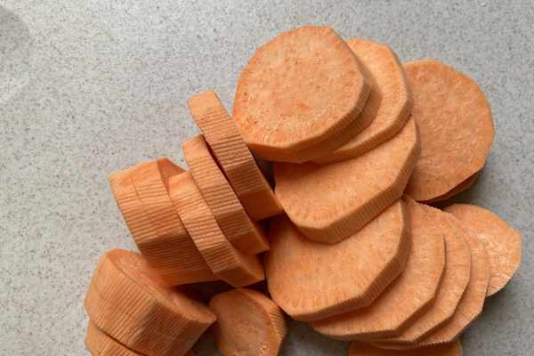 2.紅薯去皮清洗乾淨放案板上切成小塊。