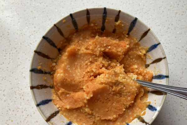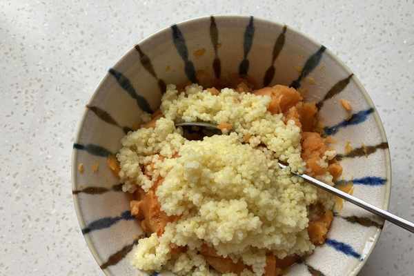 6.將紅薯泥和小米攪拌均勻。