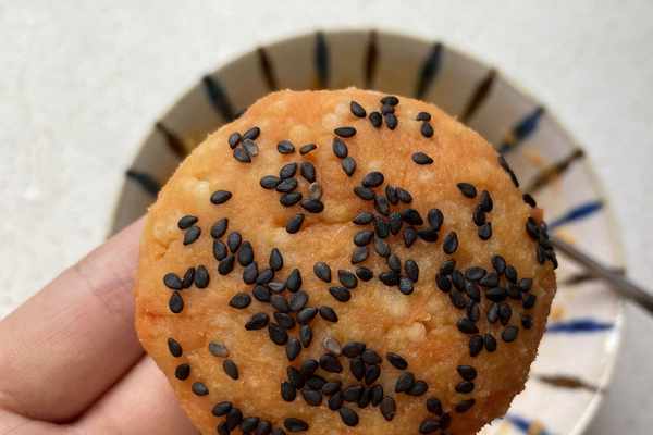 7.挖上一勺小米紅薯泥,搓圓後稍稍按扁表面撒上黑芝麻。