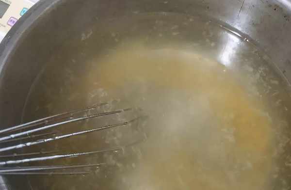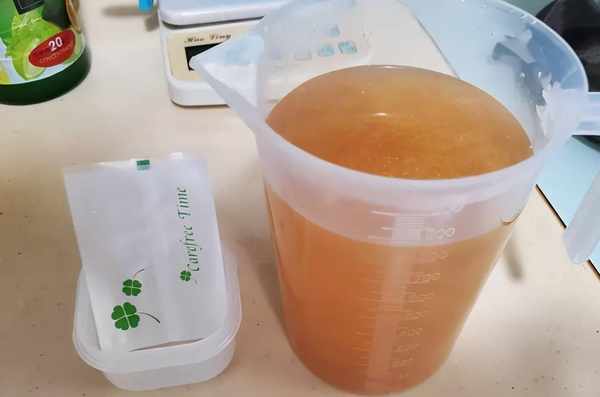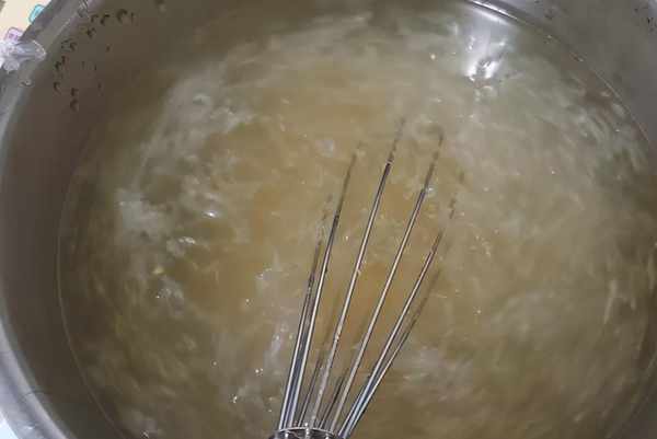 1、將寒天條剪碎段泡水20分鐘以上(我是睡前泡得起來就可以制作)柚子醬秤重700克食用亮粉兩小湯匙,寒天切段泡水,量好水量鍋子不夠大我分兩鍋做,水滾柚子醬放入,寒天條瀝幹。
