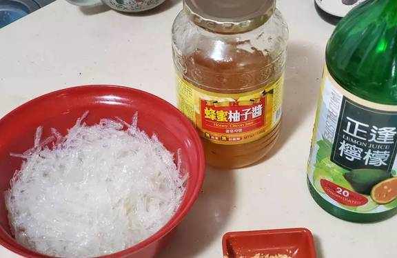 食材:蜂蜜柚子醬700克、水3000cc、檸檬濃縮汁30cc、寒天條1包37克、食用亮粉2小湯匙
