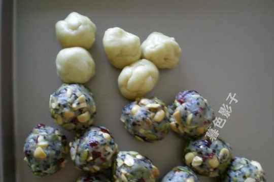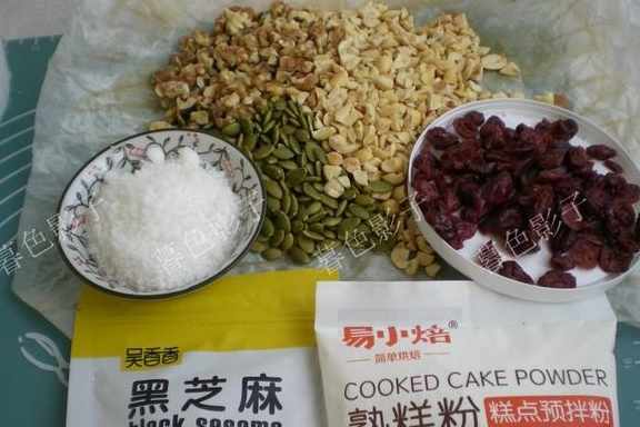 製作步驟:1、五仁月餅的主要配料,事先做好的五仁要炒好,糖漿,模具,月餅粉等等。