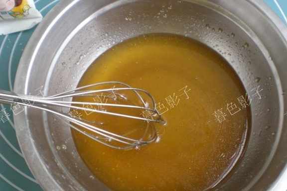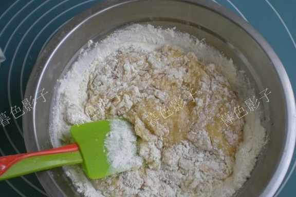3,在糖漿裏加月餅預拌粉,用矽膠刀翻拌到無乾粉。