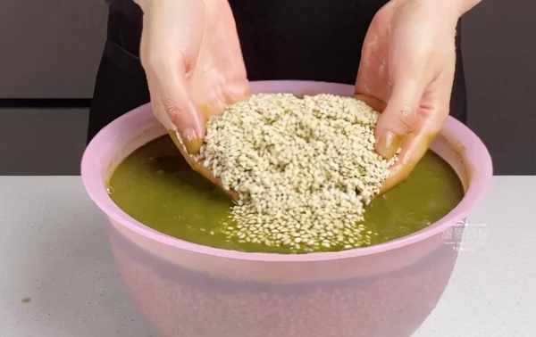 4、盆中倒入3斤糯米、烏飯葉汁,混合均勻放入冰箱冷藏浸泡一夜;