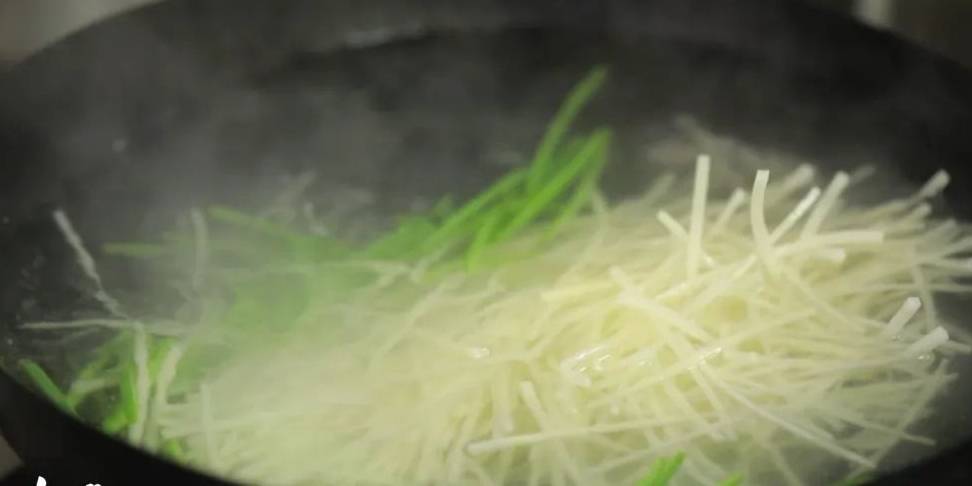 土豆絲爽脆的精髓也在這瞭,焯水隻需3-4秒!時間多瞭土豆太糯,少瞭則過生出鍋撈出後,立馬泡進冰水裡半分鐘。