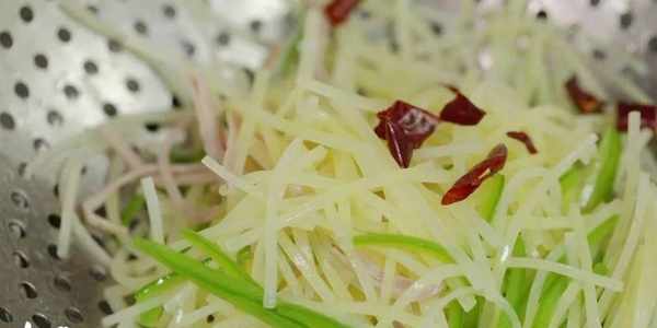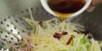 降溫就在這一瞬間,使土豆保持脆度03先調味再翻炒縮短烹飪時間保證口感第三步:爆炒土豆絲浸泡完成後撈出調味。在食材中加入4-6顆幹辣椒、1.5調羹康樂醋、0.5調羹鹽和0.5調羹糖,調味。????