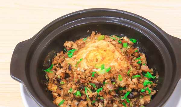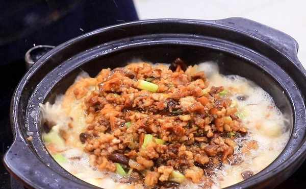 把剛才炒好的肉沫、香菇盛放在砂鍋裡面,蓋上鍋蓋開小火再燜煮2分鐘就可以瞭,出鍋前撒上蔥花美味即成。
