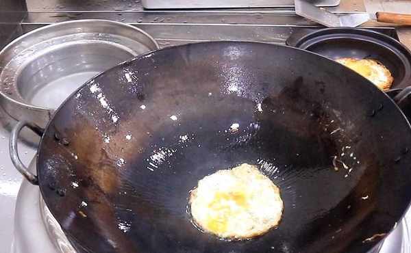 煎雞蛋的時候要先滑鍋以免粘鍋,然後倒出熱油加入涼油,油溫五成熱時把雞蛋打入鍋中經常搖晃鍋讓其均勻受熱,保持小火把蛋液煎至兩面金黃盛放在砂鍋中備用。