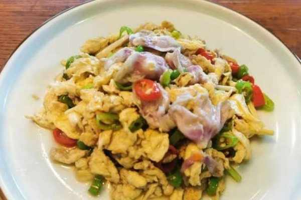 原料:木槿花若幹朵,雞蛋3個,大蒜、蔥、辣椒適量