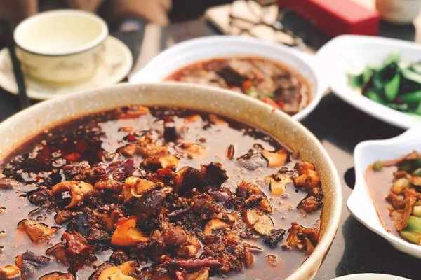 毛血旺以血為尊,一碗裝百味,湯汁紅亮、麻辣鮮香、味濃味厚,出自重慶磁器口鎮,是重慶江湖菜的鼻祖。