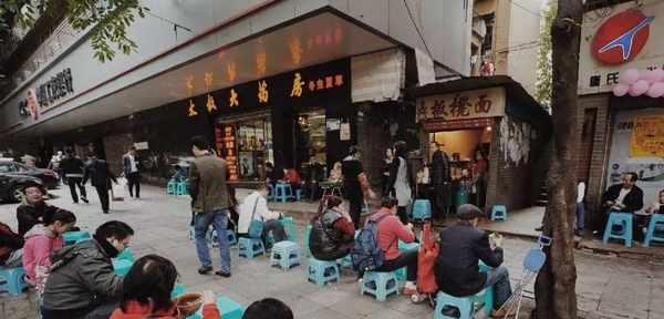 一根高板凳當飯桌,齊刷刷地坐一排,打扮精致的美女、文質彬彬的商務精英、或是青春稚氣的學生、渾身灰泥的建築工人……挽起秀發、扯開領帶、卸下眼鏡、擼起袖子,迎接這最早的一餐,直到吃得滿嘴流油,辣得饅頭大汗方才過癮。