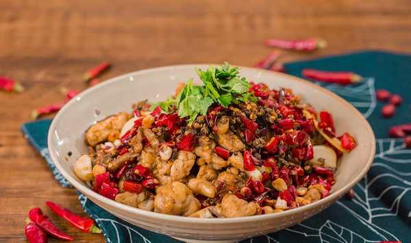 流行於歌樂山一帶,傢養土仔公雞現殺現烹,輔以辣椒、花椒,這樣烹出的菜品,麻辣酥香,鮮嫩化渣。