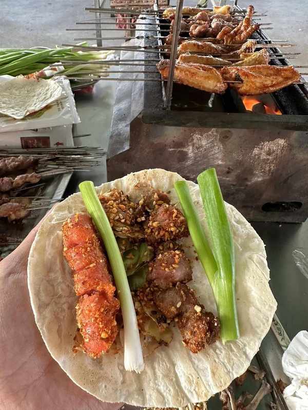 這一桌燒烤菜品其實跟各地的燒烤品種並沒有獨特之處,淄博燒烤的靈魂三件套,就是雙層烤爐、小蔥和小餅,劉康一傢四口點的菜品主要有這幾種: