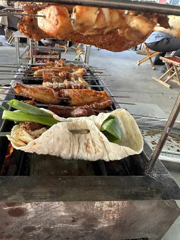 來到燒烤城的時候已經接近下午三點,這裡也已經開啟瞭人山人海的模式,雖然人比較多,但是一切都井然有序,劉康一傢逛瞭一會,找瞭一傢有空位的店坐下,開啟這次淄博之行的主題——擼串。