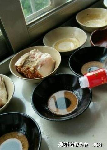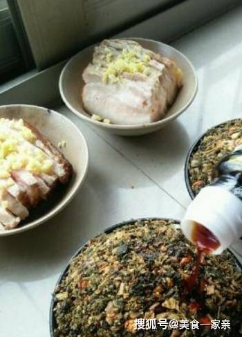 十六,塞好梅菜後,往中間有肉片的梅菜上面淋上醬油,均勻些,轉圈圈淋,最好每塊肉能吸收到醬油。