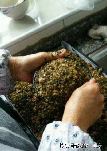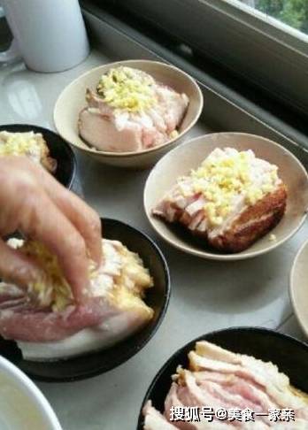 十四,肉片灑好生薑大蒜末後,就開始往碗裡塞梅菜,壓嚴實一些,塞塞塞~~【梅菜裡面是有加鹽的,所以制作過程是不需要額外加鹽的,但是制作好後,需要在肉片表面淋上醬油,請看過程】