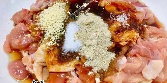 3、取一湯碗放入雞塊,放入鹽、味精、料酒、雞精和胡椒粉拌勻,再放入蚝油和蒸魚豉油抓勻,滴幾滴香油,放入醬油調色。鹽要少放,蚝油和豉油的鹹度基本上可以滿足醃制的底味。