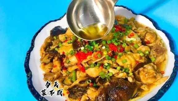 7、起鍋燒熱放入沙拉油燒至八成熱(冒煙狀)關火,趁熱將熱油淋在小蔥花上面。激發出葱香味,香菇蒸滑雞製作完成。