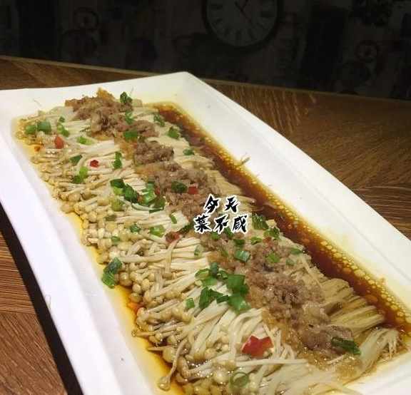 5、蒸鍋上火放入清水燒開,放入金針菇蒸8分鐘左右,淋上少許蒸魚豉油,取出撒上小蔥花。