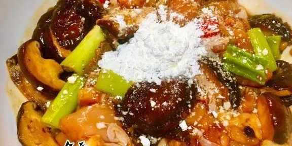 4、雞塊內放入葱薑和香菇片,放入一勺幹澱粉拌勻,多抓幾遍,讓調料和澱粉充分與雞塊混合,醃制15分鐘左右。