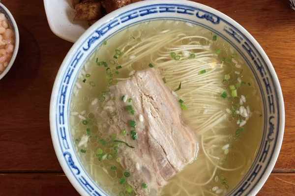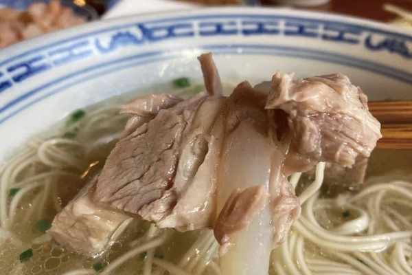 這樣一碗面,白湯白肉,清清爽爽,卻內涵豐富——肉選的是上等硬肋五花,帶軟骨的為佳。需要先文火慢燉5小時,再進糟鹵醬汁數個小時而成;湯則是雞骨、肉骨、黃鱔骨和魚骨的混合高湯,秘訣之處是增加瞭酒釀,給面湯提供一絲酸和酒香,鮮味更加復合;至於面條,則是久泡不軟的機壓細面。