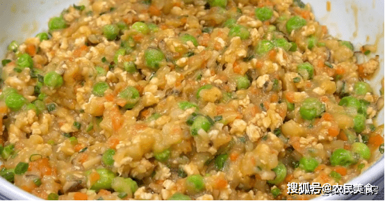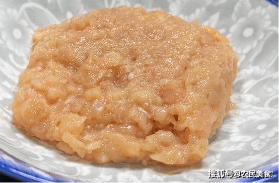 接下來,鍋中油熱後把雞胸肉末放入鍋中炒至變色,炒熟後,把配菜放進來,炒幹它們水分,然後盛出來放入土豆泥,再把蔥花放進來,加入食鹽,雞精,生抽,攪拌均勻。