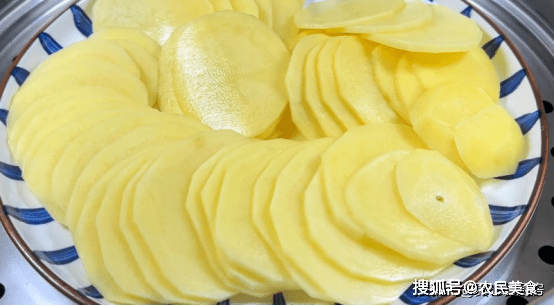 首先準備兩個黃心土豆,用刮皮刀刮去外皮,把土豆切成片,再放入盤中。然後放入蒸鍋裡上鍋蒸熟。