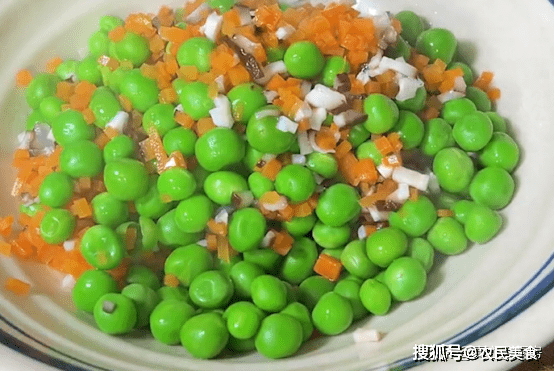 土豆蒸好後壓成泥。鍋中水燒開後,把青豆倒入鍋中煮至斷生,再把香菇丁和胡蘿卜放入鍋中焯水一分鐘。煮好後控水撈出。