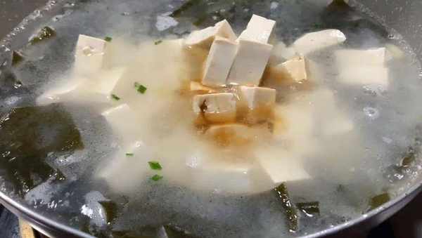 3.15分鐘後,開始調味,隻需要放適量食鹽和雞精調味即可,將調料充分化開,海帶豆腐湯就做好瞭。