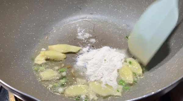 1.起鍋燒油,油熱下入蔥薑爆香,再加一小勺面粉,繼續炒出香味。