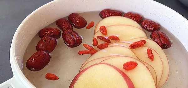 2.果子、紅棗、枸杞涼水下鍋,大火煮開後,轉小火煮5分鐘,再放入山楂煮3分鐘。