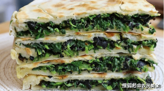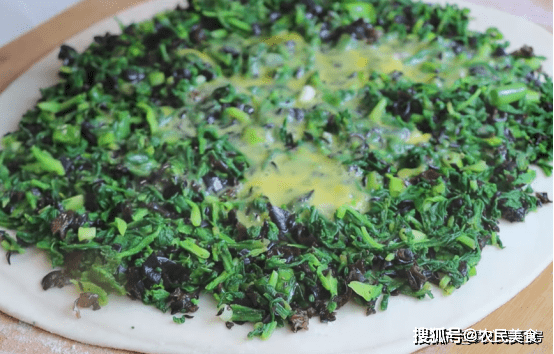 然後放在案板上切成兩半,整理成圓形,搟成大薄餅,放上調好的餡料攤均勻,把打好的雞蛋液均勻的淋到上面,上面再蓋上一張面皮,用手按壓一下,擠出裡面的空氣。